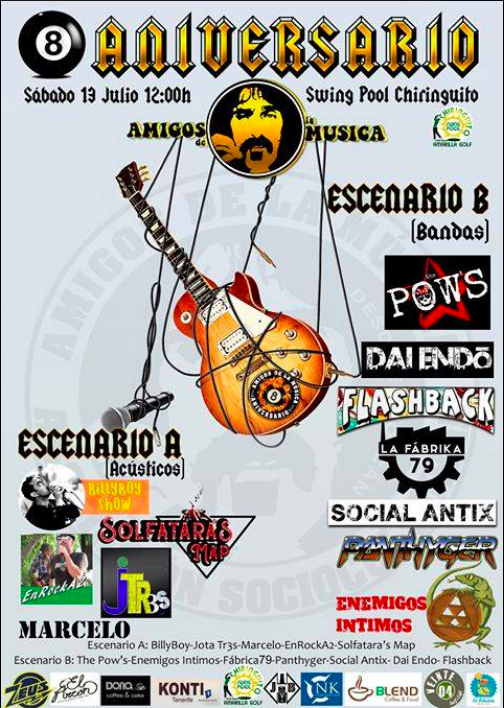 ¡¡¡El próximo sábado 13 de julio se va a liar parda!!! Una docena de bandas canarias se juntarán para celebrar el 8º aniversario de Amigos de la Música. ¡¡¡No te lo puedes perder, va a ser brutal!!!